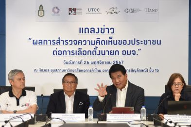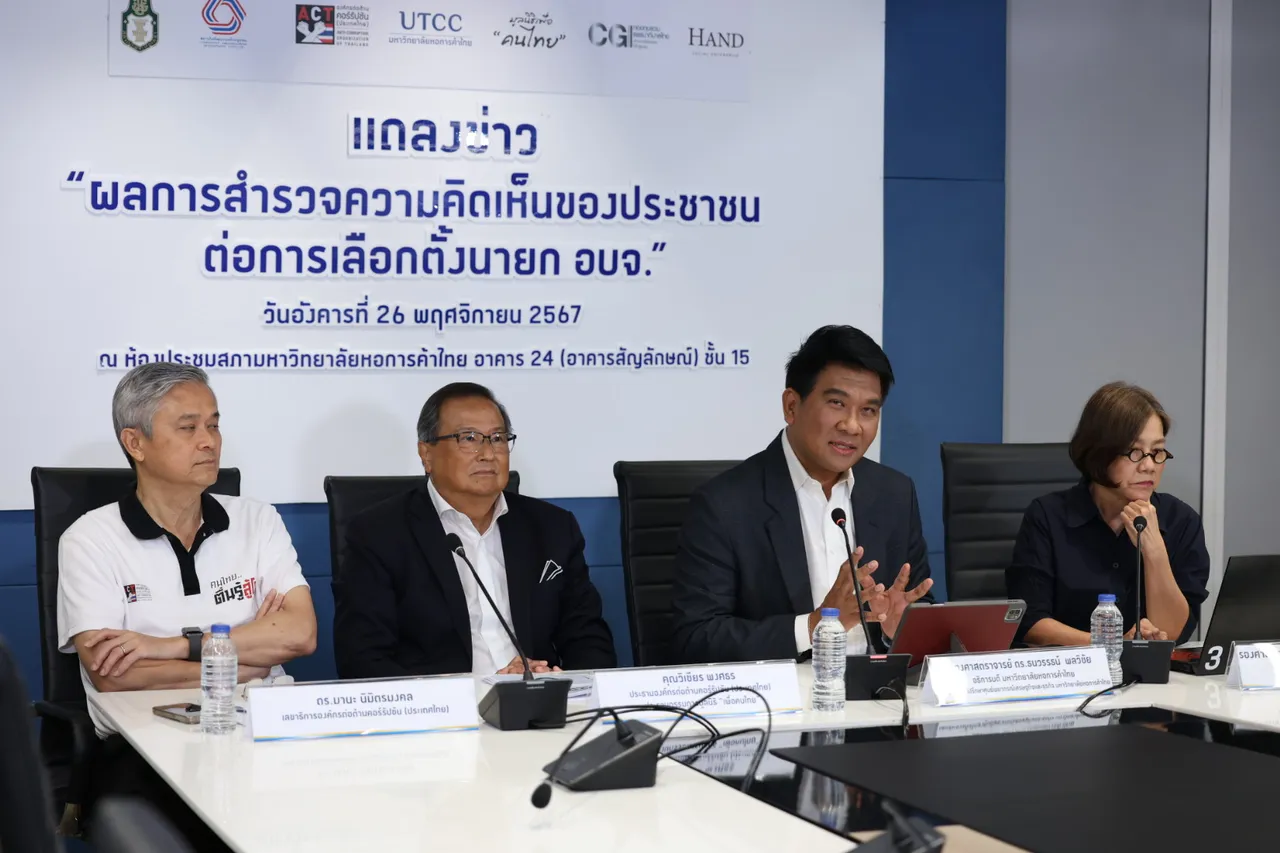 เมื่อวันที่ 26 พ.ย. ที่ผ่านมา มหาวิทยาลัยหอการค้าไทย มูลนิธิเพื่อคนไทย, องค์กรต่อต้านคอร์รัปชัน (ประเทศไทย) และภาคีเครือข่าย ร่วมกันแถลง “ผลการสำรวจความคิดเห็นของประชาชนต่อการเลือกตั้งนายก อบจ.” สำรวจความคิดเห็นประชาชน 2,017 ตัวอย่างทั่วประเทศ ระหว่างวันที่ 1-11 ตุลาคม 2567 โดยเป็นประชาชนจากเขตเมืองใหญ่ 33% เขตชนบท 67% เป็นผู้ที่เคยเลือกตั้งมาแล้ว 80% และเป็นผู้เลือกตั้งครั้งแรก (First Voter) 20%
