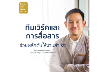 คุณพุฒิเศรษฐ์ ได้มารับหน้าที่บริหารจัดการโปรเจกต์ต่างๆใน Raya Creative Keys เสริมว่า หากให้นิยามตัวตนของ Raya Creative Keys เราก็คือ บริษัทไทยที่มีประสบการณ์ในการทำธุรกิจโรงแรม และการบริการที่ครบวงจรมาอย่างยาวนาน สิ่งที่เราต้องการส่งต่อให้กับลูกค้าคือ ภูมิปัญญาของชุมชน ผ่าน 3 แกนหลัก คือ การหล่อเลี้ยงคุณค่าของศิลปะวัฒนธรรมไทย (nurturing the value of Thai culture and heritage art) การผสานและเป็นหนึ่งเดียวกับธรรมชาติ (enhancing the strong relationship with nature) และการสร้างการมีส่วนร่วมและพัฒนาชุมชน (initiating community engagement) ดังนั้นไม่ว่าเราจะรับงานประเภทใดก็ตาม เราก็ต้องไม่ลืมตัวตนของเรา และส่งต่อสิ่งเหล่านี้ด้วยคุณภาพและความคิดสร้างสรรค์ให้กับลูกค้าเพื่อให้งานสำเร็จตามเป้าหมายที่ตั้งไว้”