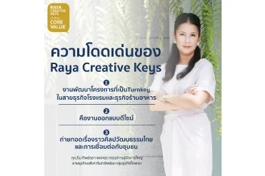 คุณทิพย์ชยา เล่าต่อว่า “Raya Creative Keys จะเป็นครีเอทีพเอเจนซี่ที่รับงาน 3 ประเภทหลัก คือ 1. งานพัฒนาโครงการที่เป็น Turnkey ในสายธุรกิจโรงแรมและธุรกิจร้านอาหาร คือ รับทำตั้งแต่การวางแบรนด์คอนเซปต์ การออกแบบและบริหารโครงโครงการก่อสร้าง ดูแลงบประมาณ การจัดซื้อจัดจ้าง รวมไปถึงการจัดงานเปิดตัว การฝึกอบรมพนักงานก่อนที่เปิดดำเนินการ และรับงานบริหารจัดการต่อเนื่องอีกด้วย งานประเภทที่ 2 คือ งานออกแบบดีไซน์ เป็นโปรเจกต์สนุกๆ ซึ่งมีหลากหลาย ทั้งการพัฒนาออกแบบผลิตภัณฑ์ บรรจุภัณฑ์ การออกแบบสื่อสิงพิมพ์ รวมถึงธุรกิจร้านอาหารและเครื่องดื่ม จะเป็นงานออกแบบประสบการณ์ความพึงพอใจที่ผู้บริโภคจะได้รับ (Experience Design) ซึ่งต้องผ่านการคิดและออกแบบประสบการณ์ที่ลูกค้าจะได้รับตั้งแต่เดินเข้ามาในสถานที่นั้นๆ ครอบคลุมทั้งอาหารและเครื่องดื่ม การแต่งกายของพนักงาน รวมถึงการบริการ บรรยากาศภายในร้านทั้งเสียงดนตรี กลิ่นสัมผัสทุกองค์ประกอบ เป็นงานที่เรามีความเชี่ยวชาญและได้ฝากฝีมือกับร้านกาแฟ Mivana Flagship Store ที่ศรีนครินทร์และทำงานต่อเนื่องร่วมกับมีวนา เตรียมจะเปิดอีก 1 สาขาภายในกลางปีนี้ และส่วนสุดท้ายคือเราต้องการถ่ายทอดเรื่องราวศิลปวัฒนธรรมไทยและการเชื่อมต่อกับชุมชน ที่เรามองไปถึงการจัดนิทรรศการ การโปรโมทศิลปะวัฒนธรรมท้องถิ่นที่มีเอกลักษณ์และโดดเด่น